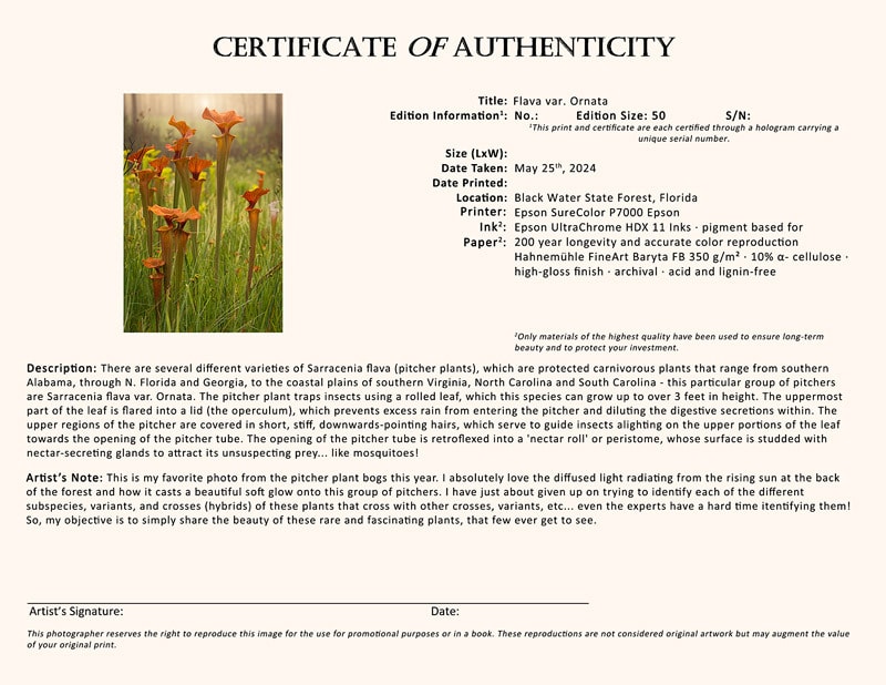 Each print is personally signed and numbered, and will come with a Certificate of Authenticity (COA) that includes a photo "Description", "Artist Note", and all the technical details of the print media. In addition, each print is given a unique serial number identified by a holographic label that is affixed to the back of the print and a matching holographic label affixed to the COA. This ensures that you have the authentic (and matching) COA that belongs to your valuable print.